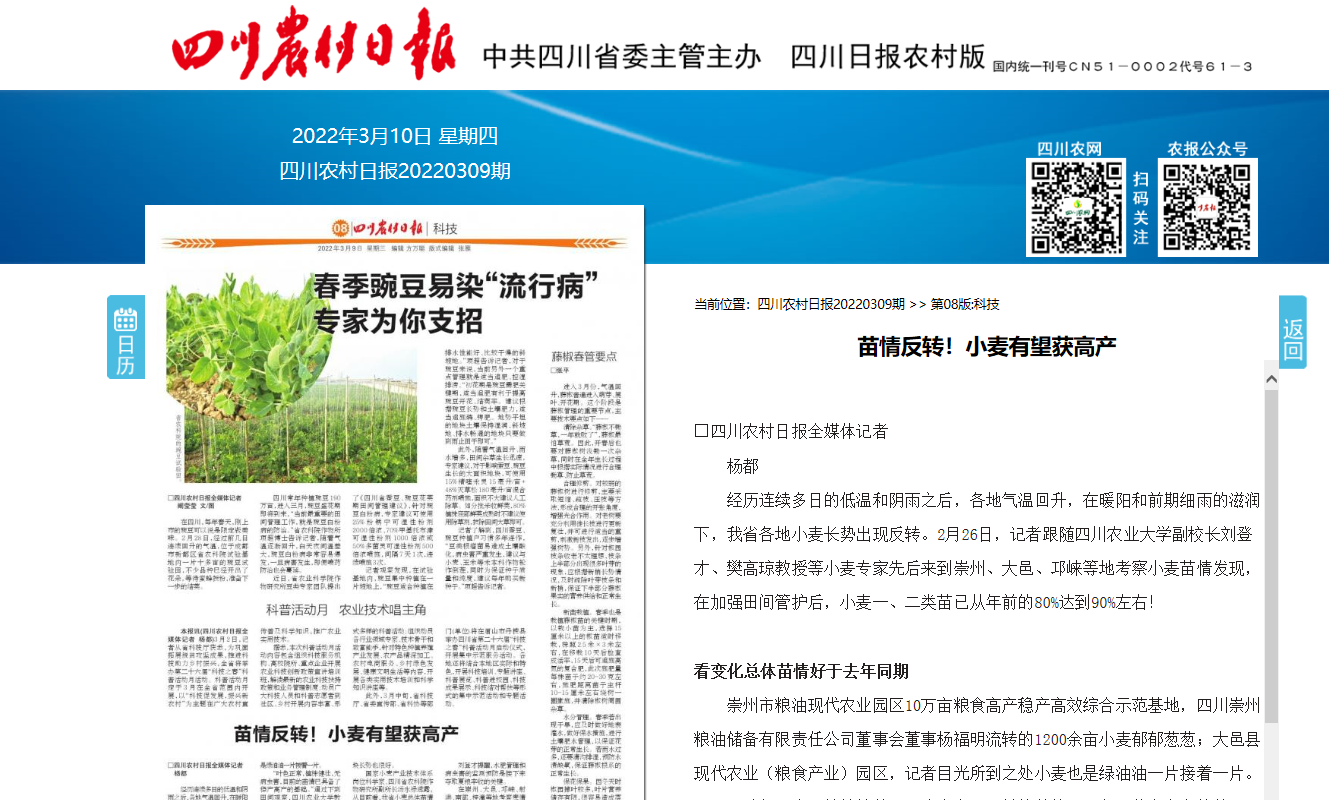 在崇州、大邑、邛崃、射洪、南部、梓潼等地考察麦情的过程中,专家们发现今年大面积推广的品种蜀麦830、绵麦902、川麦104等目前未见条锈病,极少量田块有蚜虫发生。总体评估今年病虫害发生情况较常年偏轻。
