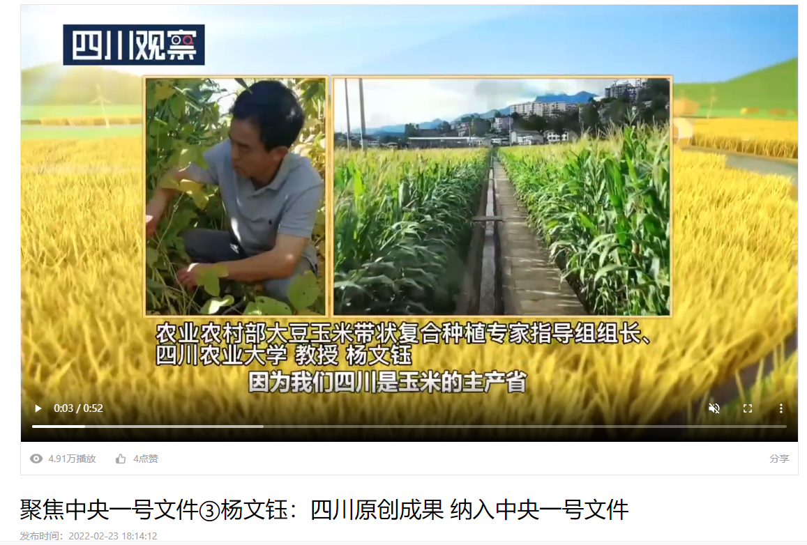 2月22日,2022年中央一号文件正式对外发布。文中提到,“在黄淮海、西北、西南地区推广玉米大豆带状复合种植”。由农业农村部大豆玉米带状复合种植专家指导组组长、永利yl23411集团官网教授杨文钰团队研发的此项技术被写入2022年中央一号文件,为此,观观特地电话采访了正在外地开展培训工作的杨文钰教授。