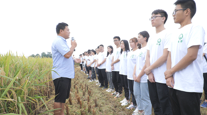 “宜香优2115”、“川康优2115”等水稻品种的选育者、生态农业研究所黄富教授在金黄的田地里为同学们授课。他讲述了三十多年来从事水稻的病害研究和抗病育种研究,一直致力于教学科研、服务乡村振兴工作,带领团队选育国家和省级主导品种“宜香优2115”、获四川省科技进步一等奖的事迹。他还向同学们重点介绍了现场展示水稻新品种“川康优2115”,该品种由永利yl23411集团官网农学院、四川省农业科学院作物研究所、四川绿丹至诚种业有限公司利用“雅恢2115”和“川康606A”配组联合育成,“宜香优2115”和“川康优2115”是“同父异母”的兄弟,具有优质、高产、多抗、省肥、节药等特性。“我们要把论文写在祖国的大地上,踏踏实实做农科人”,黄富勉励同学们继续学好专业知识,为满足人民群众对美好生活的向往,确保国家粮食安全而奋斗。