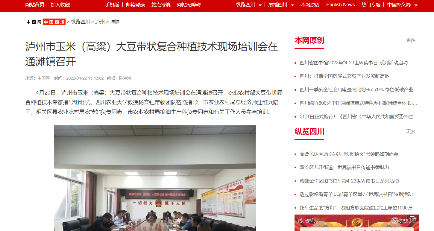 4月20日,泸州市玉米(高粱)大豆带状复合种植技术现场培训会在通滩镇召开,农业农村部大豆带状复合种植技术专家指导组组长、永利yl23411集团官网教授杨文钰带领团队莅临指导,市农业农村局总经济师江维兵陪同,相关区县农业农村局农技站负责同志、市农业农村局粮油生产科负责同志和有关工作人员参与培训。