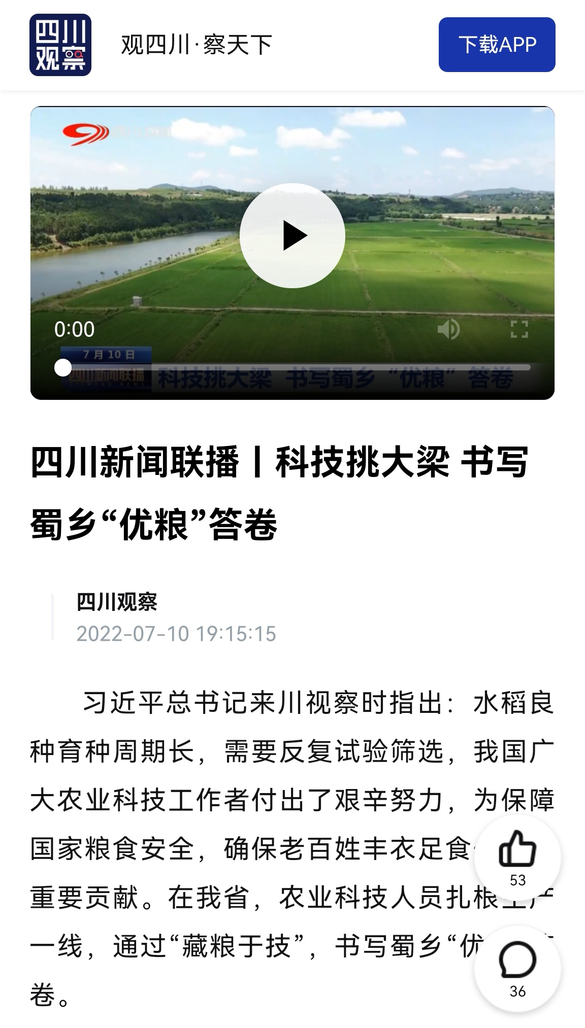 习近平总书记来川视察时指出:水稻良种育种周期长,需要反复试验筛选,我国广大农业科技工作者付出了艰辛努力,为保障国家粮食安全,确保老百姓丰衣足食作出了重要贡献。在我省,农业科技人员扎根生产一线,通过“藏粮于技”,书写蜀乡“优粮”答卷。