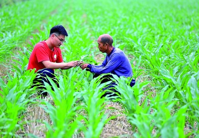 河北省曲周县,中国农业大学研究生叶松林(左)在给村民讲解玉米种植知识。新华社发