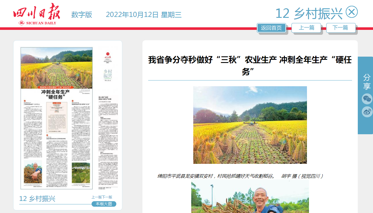 加强防灾减灾。面对夏季高温旱情,省、市、县三级均成立了技术指导队伍,深入田间地头,帮助农民群众落实抗旱措施。“在专家的技术指导下,我们及时增施抗旱剂和叶面肥,减轻了旱情。”眉山市仁寿县种粮大户王紫彬说,今年他实施了500亩玉米大豆带状复合种植,8月中旬玉米已经收获,10月下旬大豆也将成熟,预计每亩能收获150—200公斤大豆,亩均可增收600元。