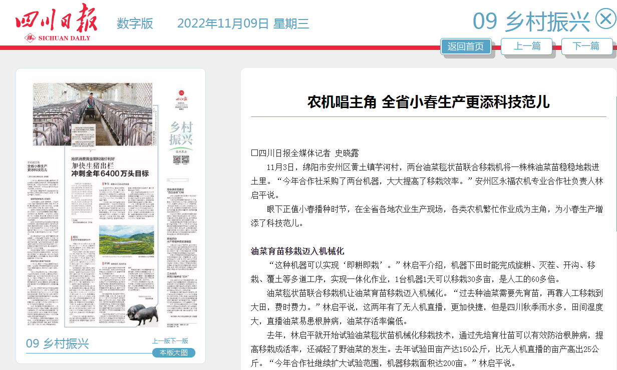 油菜毯状苗联合移栽机让油菜育苗移栽迈入机械化。“过去种油菜需要先育苗,再靠人工移栽到大田,费时费力。”林启平说,这两年有了无人机直播,更加快捷,但是四川秋季雨水多,田间湿度大,直播油菜易患根肿病,油菜存活率偏低。