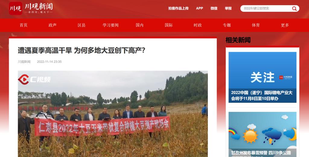 11月12日,仁寿县粮油现代农业园区内的示范片测得大豆亩产达160.5公斤,南部县南隆街道的高产创建示范片测得大豆亩产达153.95公斤。