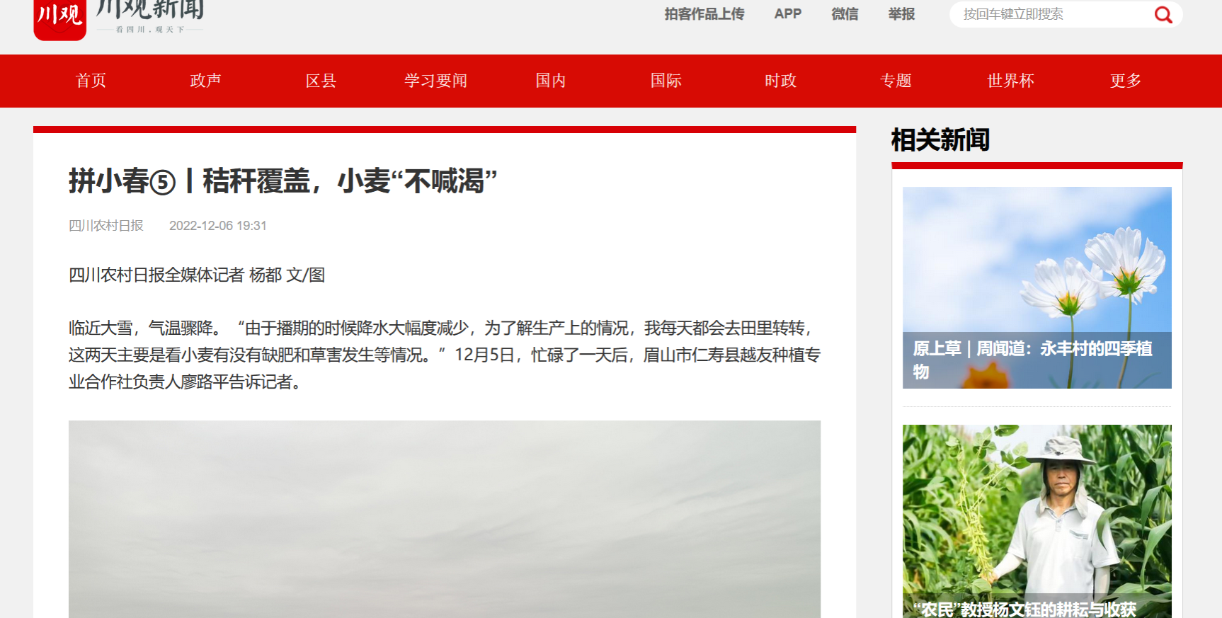 临近大雪,气温骤降。“由于播期的时候降水大幅度减少,为了解生产上的情况,我每天都会去田里转转,这两天主要是看小麦有没有缺肥和草害发生等情况。”12月5日,忙碌了一天后,眉山市仁寿县越友种植专业合作社负责人廖路平告诉记者。