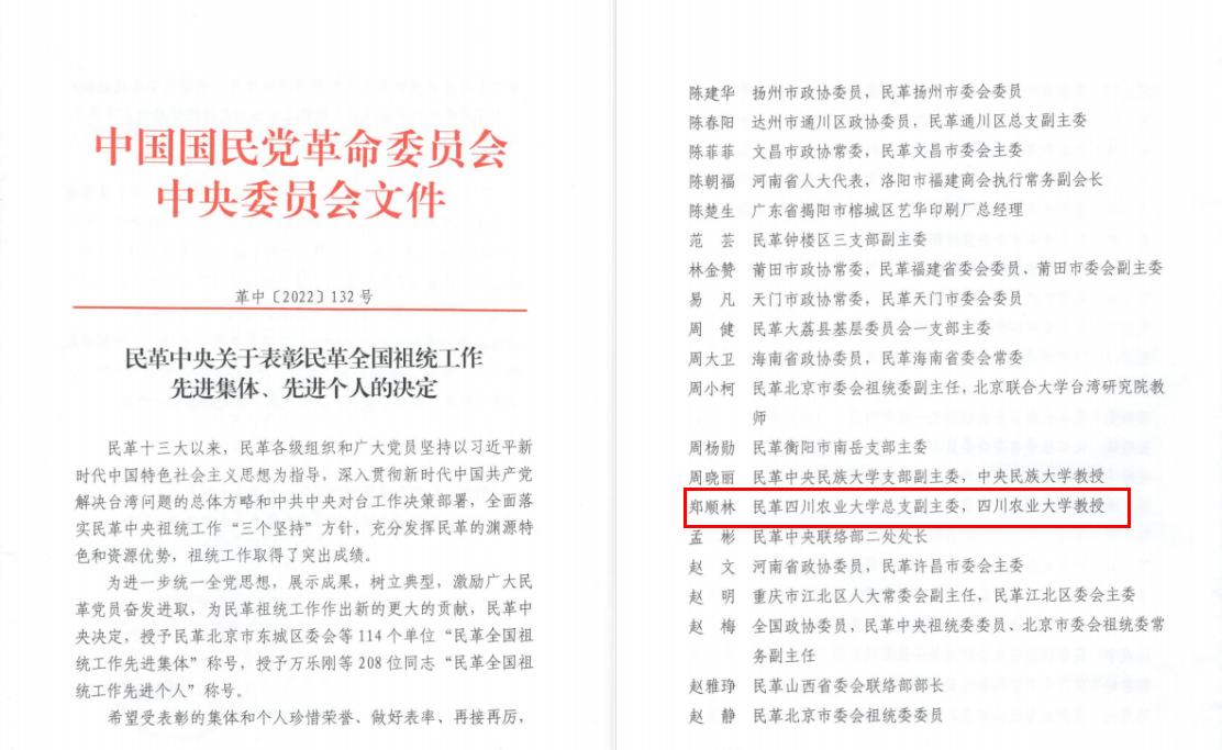 日前,为激励广大民革党员奋发进取、再创佳绩,民革中央召开全国祖统工作先进集体和先进个人表彰大会。此次大会共授予民革北京市东城区委会等114个单位“民革全国祖统工作先进集体”称号,授予万乐刚等208位同志“民革全国祖统工作先进个人”称号。民革川农大总支副主委、农学院教授郑顺林因成绩优异、贡献突出,荣获“民革全国祖统工作先进个人”荣誉称号。