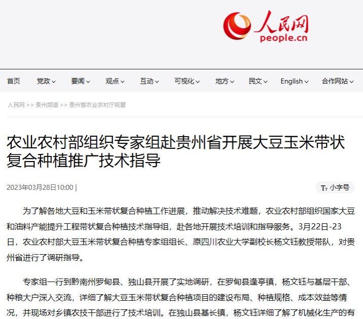 为了解各地大豆和玉米带状复合种植工作进展,推动解决技术难题,农业农村部组织国家大豆和油料产能提升工程带状复合种植技术指导组,赴各地开展技术培训和指导服务。3月22日-23日,农业农村部大豆玉米带状复合种植专家组组长、原永利yl23411集团官网副校长杨文钰教授带队,对贵州省进行了调研指导。