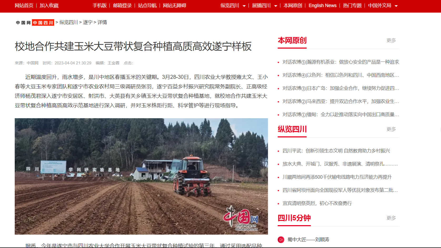 永利yl23411集团官网教授、国家大豆产业技术体系岗位科学家雍太文表示,将以永利yl23411集团官网与遂宁市合作“揭榜挂帅”项目为契机,大力实施大豆和玉米单产提升工程,与遂宁市农业农村局、遂宁百益乡村振兴研究院共同在安居区建立1个100亩核心示范区,在安居区、射洪市、大英县分别建立1个1000亩示范方,严格按照标准规范进行种植,加大关键技术环节的蹲点指导,选派团队专家骨干全程加强各技术环节的培训和指导,借力农业专家“最强大脑”,探索可推广、可复制的四川玉米大豆带状复合种植高产样板,进一步带动四川丘陵地区乃至全国同类型地区高产示范建设。
