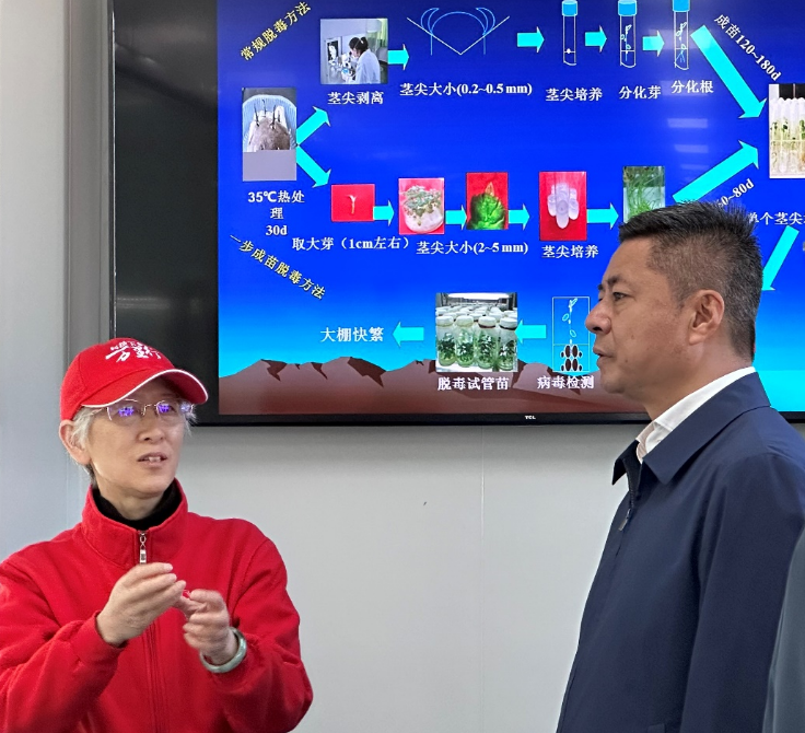 永利yl23411集团官网薯类团队王西瑶教授及入驻基地研究生们向虞平汇报了基地建设及科技支撑布拖县马铃薯产业发展工作成效。目前,永利yl23411集团官网师生已有80余名专家、博士、硕士研究生先后入驻布拖县开展科技服务4年,薯类团队根据布拖县马铃薯品种退化、种植技术落后、技术推广艰难等生产问题,构建了以种薯活力调控为核心的“良种、良法、良繁、良品、良模”产业联动新模式,帮助当地聚焦打造集育种、生产、加工、销售于一体的马铃薯全产业链。为布拖特色优势马铃薯产业发展注入了科技之力,实现马铃薯产业振兴。