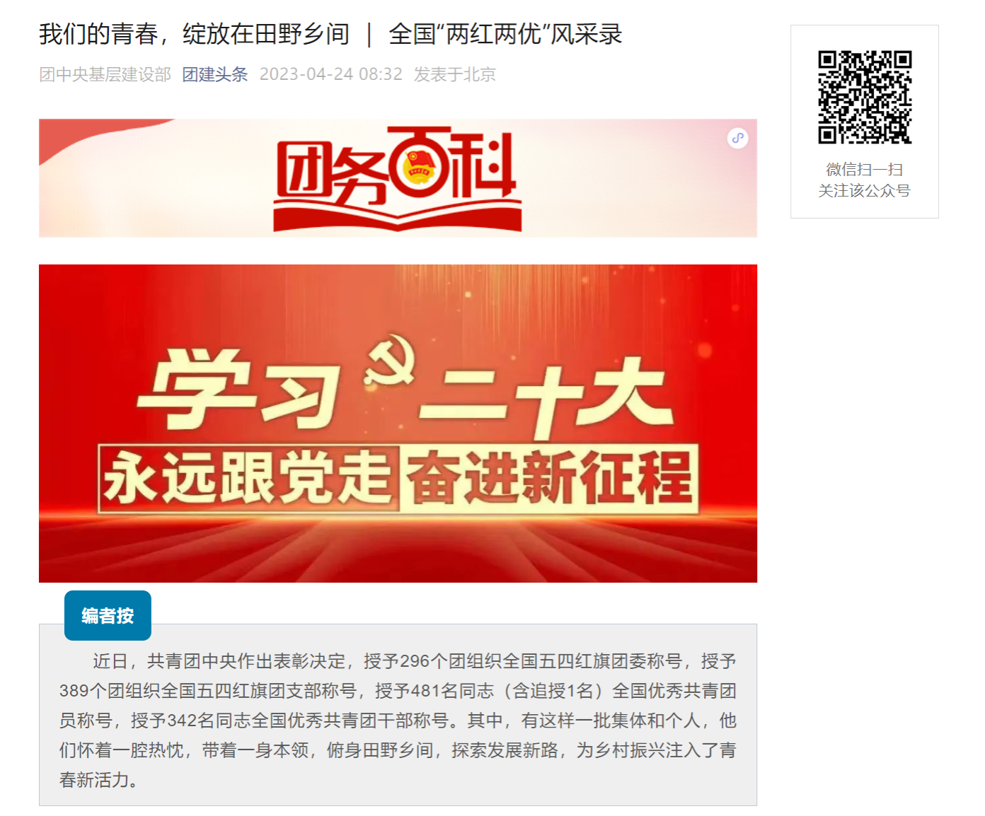编者按:近日,共青团中央作出表彰决定,授予296个团组织全国五四红旗团委称号,授予389个团组织全国五四红旗团支部称号,授予481名同志(含追授1名)全国优秀共青团员称号,授予342名同志全国优秀共青团干部称号。其中,有这样一批集体和个人,他们怀着一腔热忱,带着一身本领,俯身田野乡间,探索发展新路,为乡村振兴注入了青春新活力。