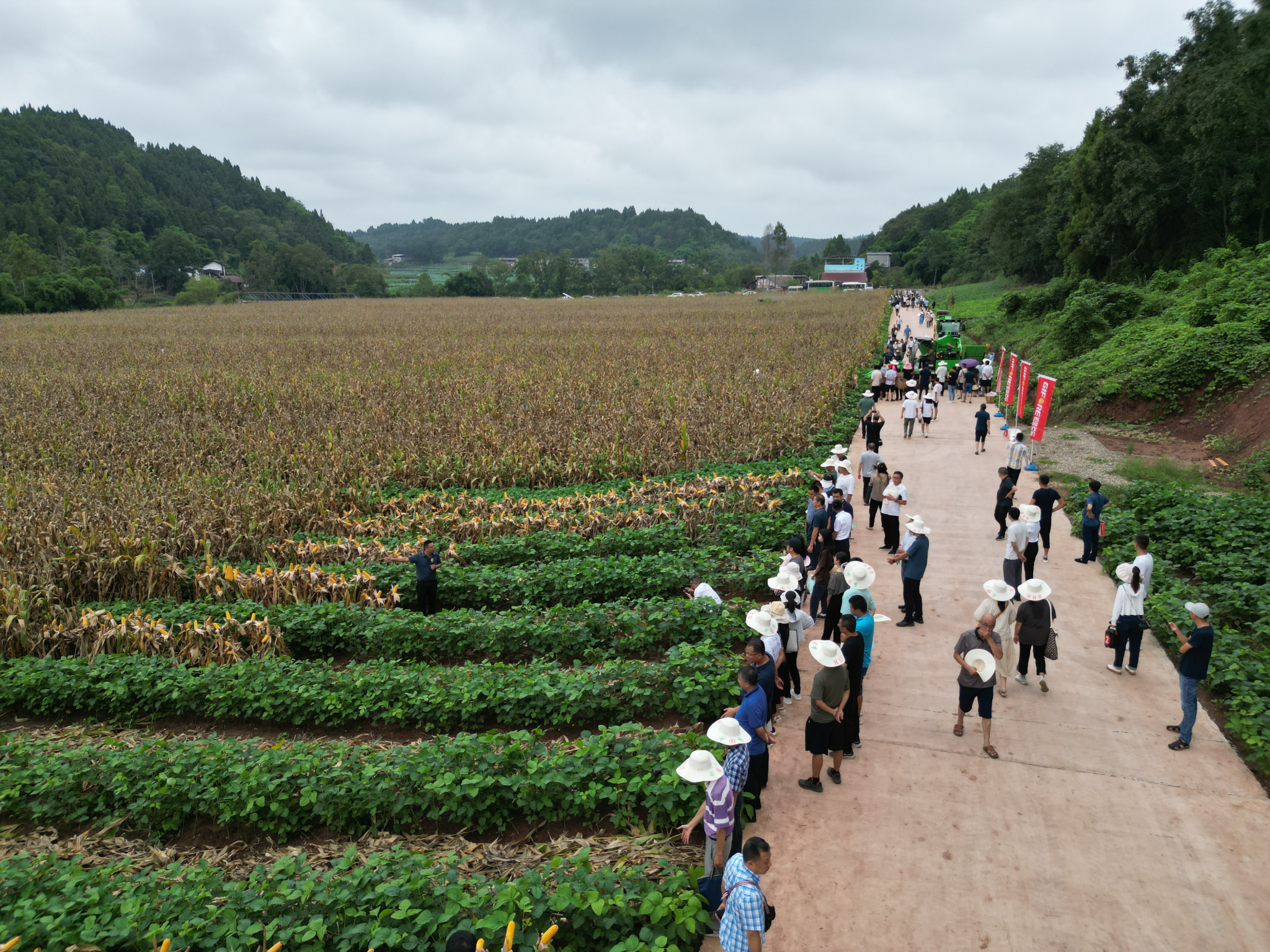 盛夏时节,玉米金黄,天府大地一派丰收景象。8月6日,全省大豆玉米带状复合种植现场观摩培训及玉米机收测产会在遂宁市安居区成功举办。来自全国农业技术推广服务中心、中国农业科学院、吉林省农业科学院、四川省农业科学院的专家以及全省15个地市的农技干部与种植大户、校地企业代表、媒体记者等百余人,观摩考察了由永利yl23411集团官网和省农业技术推广总站、安居区人民政府共建的“全国(遂宁市安居区)大豆玉米带状复合种植示范片”。全国农业技术推广服务中心科长蒋静怡、省农业农村厅种植业与农药肥料处处长刘代银、省农业科学院副院长刘永红出席开幕式,学校科技处副处长杜俊波、农学院副院长杨峰,安居区区委常委、宣传部部长谭久宏等领导和专家参加会议并致辞。