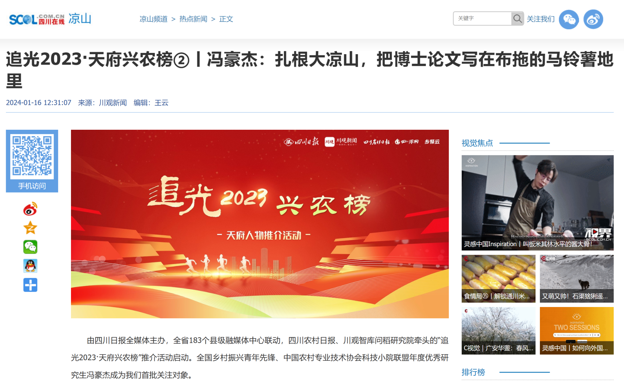 由四川日报全媒体主办,全省183个县级融媒体中心联动,四川农村日报、川观智库问稻研究院牵头的“追光2023·天府兴农榜”推介活动启动。全国乡村振兴青年先锋、中国农村专业技术协会科技小院联盟年度优秀研究生冯豪杰成为我们首批关注对象。