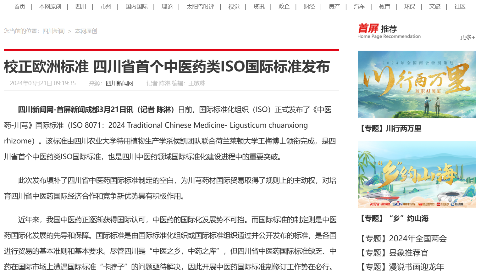 四川新闻网-首屏新闻成都3月21日讯(记者 陈淋)日前,国际标准化组织(ISO)正式发布了《中医药-川芎》国际标准(ISO 8071:2024 Traditional Chinese Medicine- Ligusticum chuanxiong rhizome)。该标准由永利yl23411集团官网特用植物生产学系侯凯团队联合荷兰莱顿大学王梅博士领衔完成,是四川省首个中医药类ISO国际标准,也是四川中医药领域国际标准化建设进程中的重要突破。