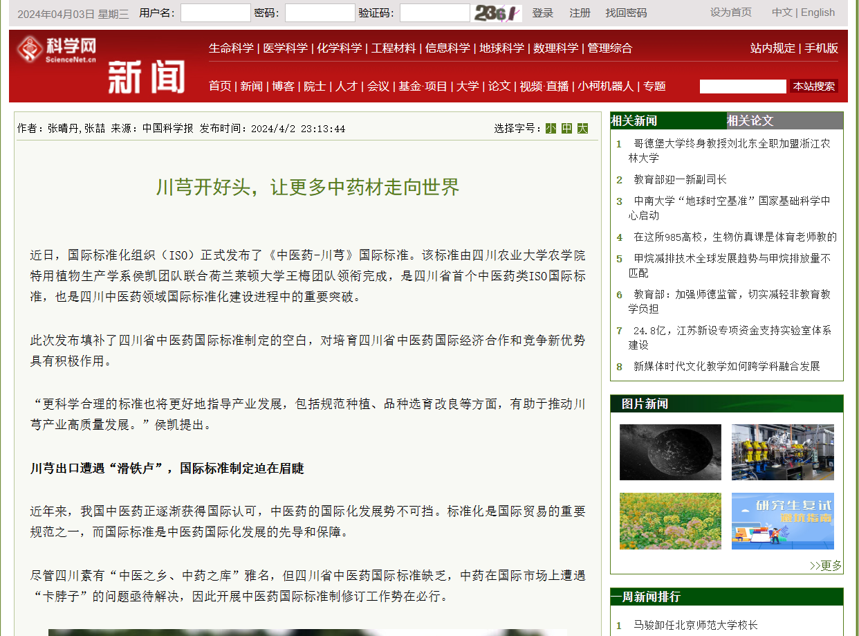 近日,国际标准化组织(ISO)正式发布了《中医药-川芎》国际标准。该标准由永利yl23411集团官网农学院特用植物生产学系侯凯团队联合荷兰莱顿大学王梅团队领衔完成,是四川省首个中医药类ISO国际标准,也是四川中医药领域国际标准化建设进程中的重要突破。
