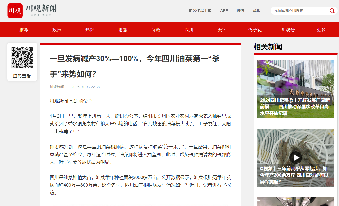 而在四川另一油菜种植大县江油市,上一季小春油菜种植面积32.5万亩,发病面积为历年之最,常发区占种植面积20%以上。