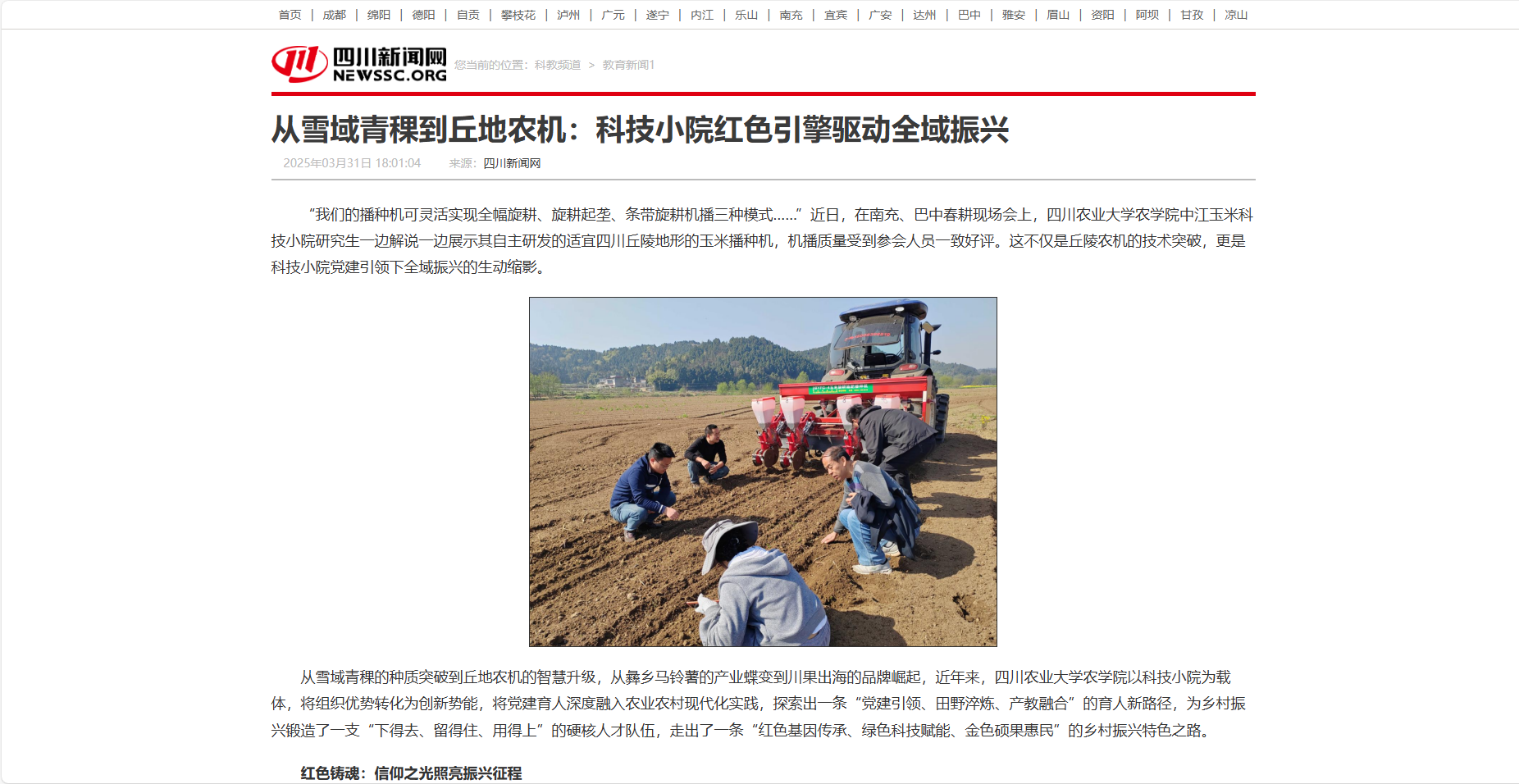 从雪域青稞的种质突破到丘地农机的智慧升级,从彝乡马铃薯的产业蝶变到川果出海的品牌崛起,近年来,永利yl23411集团官网农学院以科技小院为载体,将组织优势转化为创新势能,将党建育人深度融入农业农村现代化实践,探索出一条“党建引领、田野淬炼、产教融合”的育人新路径,为乡村振兴锻造了一支“下得去、留得住、用得上”的硬核人才队伍,走出了一条“红色基因传承、绿色科技赋能、金色硕果惠民”的乡村振兴特色之路。