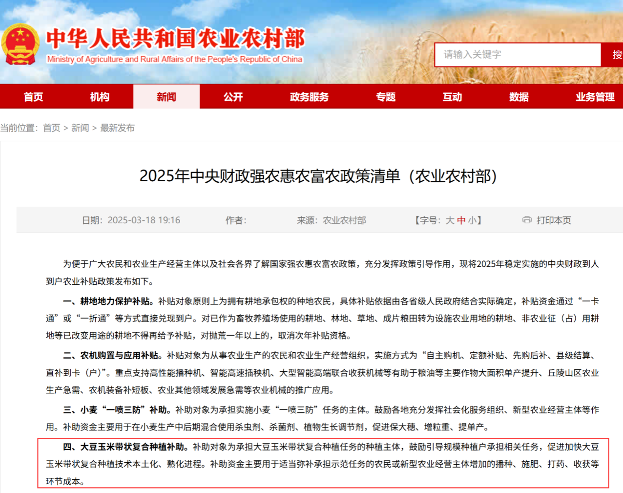 近日,农业农村部印发《2025年9+25项强农惠农富农政策》,聚焦种植主体实际需求,针对关键生产环节实施精准补贴,进一步激发规模化种植积极性。其中,明确将永利yl23411集团官网“大豆玉米带状复合种植推广”列为专项补助项目。这是该技术推广连续第四年获得国家政策扶持。