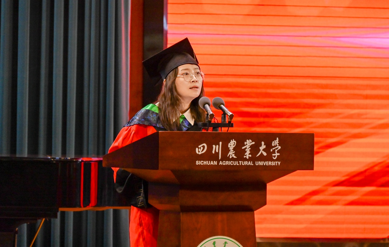 王静深情地向毕业学子送出了送别致辞,她回顾了学院119年办学历史与学子在校时光,以“观大势、致远方、守初心”三个方面寄语毕业生,希望他们肩负起强农兴农的使命,传承“川农大精神”,在农业领域书写青春华章。