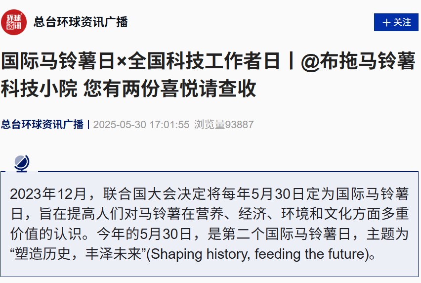2023年12月,联合国大会决定将每年5月30日定为国际马铃薯日,旨在提高人们对马铃薯在营养、经济、环境和文化方面多重价值的认识。今年的5月30日,是第二个国际马铃薯日,主题为“塑造历史,丰泽未来”(Shaping history, feeding the future)。