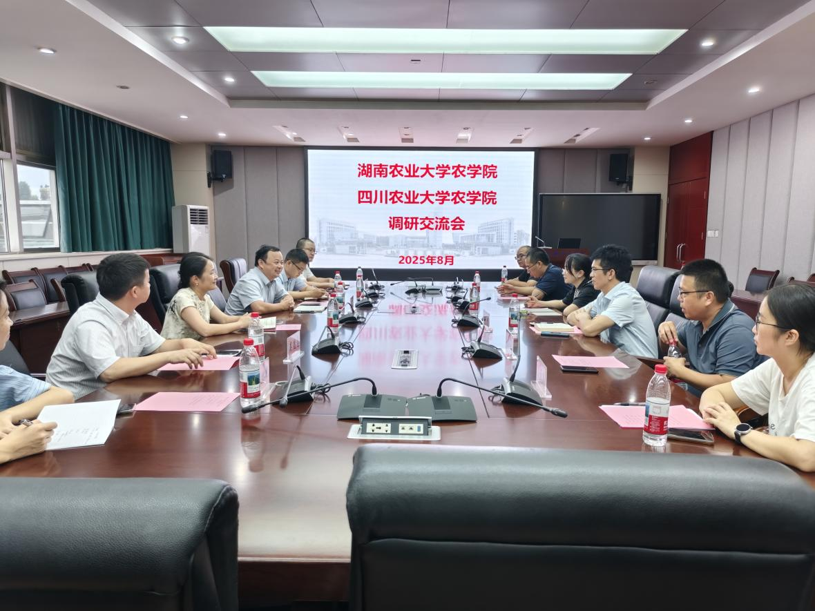 2025年8月6日,湖南农业大学农学院院长吴俊教授率团一行6人赴学院开展调研交流。交流会重点围绕学科建设、高层次人才引培、大学文化建设等方面进行交流。会议由副院长王强主持,学院院长王静、党委书记唐城,系主任雍太文、陈华保、蒲至恩等出席会议。