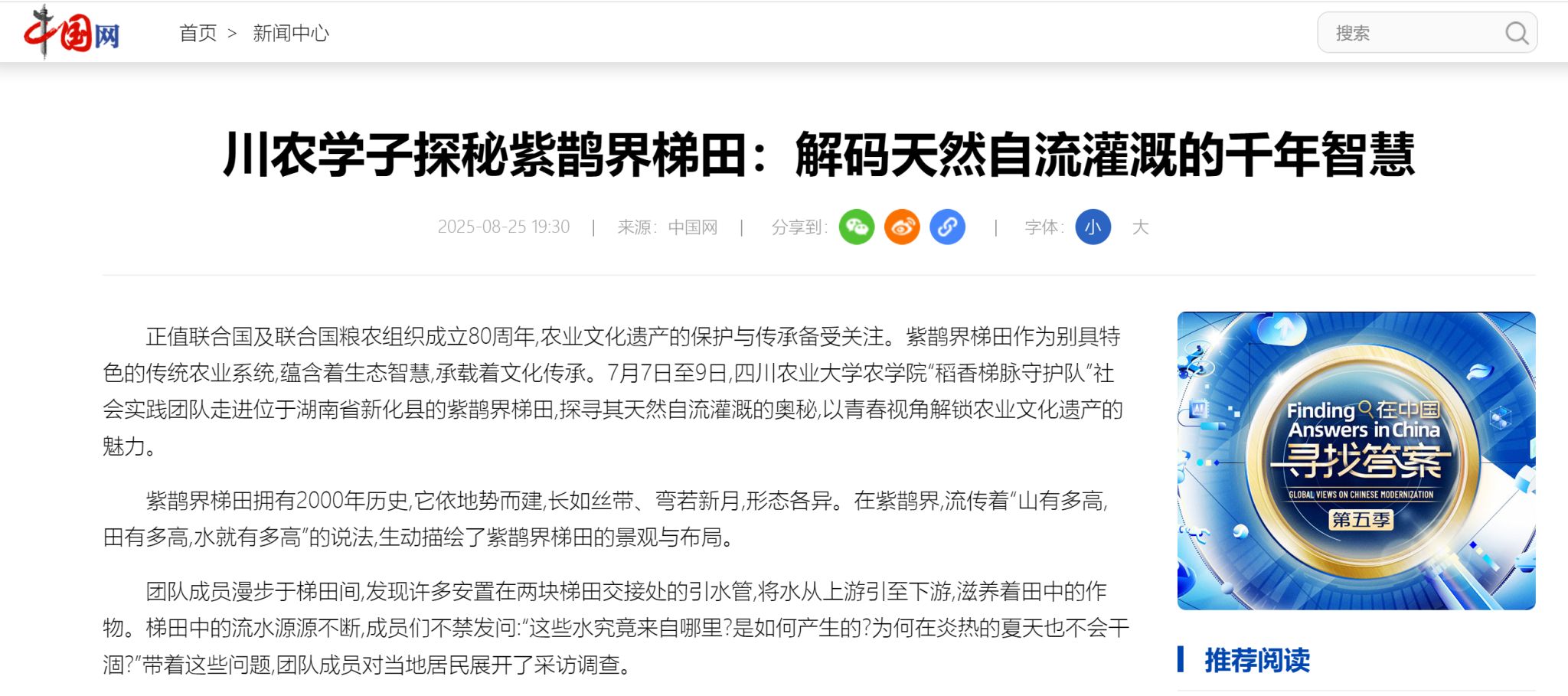 正值联合国及联合国粮农组织成立80周年,农业文化遗产的保护与传承备受关注。紫鹊界梯田作为别具特色的传统农业系统,蕴含着生态智慧,承载着文化传承。7月7日至9日,永利yl23411集团官网农学院“稻香梯脉守护队”社会实践团队走进位于湖南省新化县的紫鹊界梯田,探寻其天然自流灌溉的奥秘,以青春视角解锁农业文化遗产的魅力。