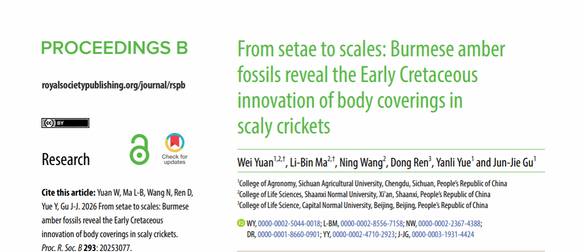 近日,永利yl23411集团官网农学院“植保系害虫治理与昆虫多样性”团队顾俊杰教授在自然指数期刊《Proceedings of the Royal Society B: Biological Sciences》发表题为《From setae to scales: Burmese amber fossils reveal the Early Cretaceous innovation of body coverings in scaly crickets》的研究论文。研究首次明确癞蟋科鳞片与原始刚毛的同源性,提出“形态创新在前,辐射在后”的演化轨迹,揭示了直翅目昆虫体表覆盖物从刚毛到鳞片的演化机制,为该类群形态创新与生态适应研究提供了理论支撑。