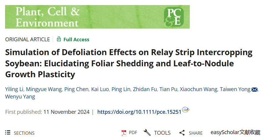 11月11日,永利yl23411集团官网农学院玉米大豆带状复合种植与循环利用团队在国际知名期刊《Plant, Cell & Environment》上发表了题为“Simulation of Defoliation Effects on Relay Strip Intercropping Soybean: Elucidating Foliar Shedding and Leaf-to-Nodule Growth Plasticity”的研究论文。该研究探讨了花后大豆落叶和叶片根瘤功能性状可塑性,揭示了大豆叶片凋落和带状套作优化源库功能的新机制。