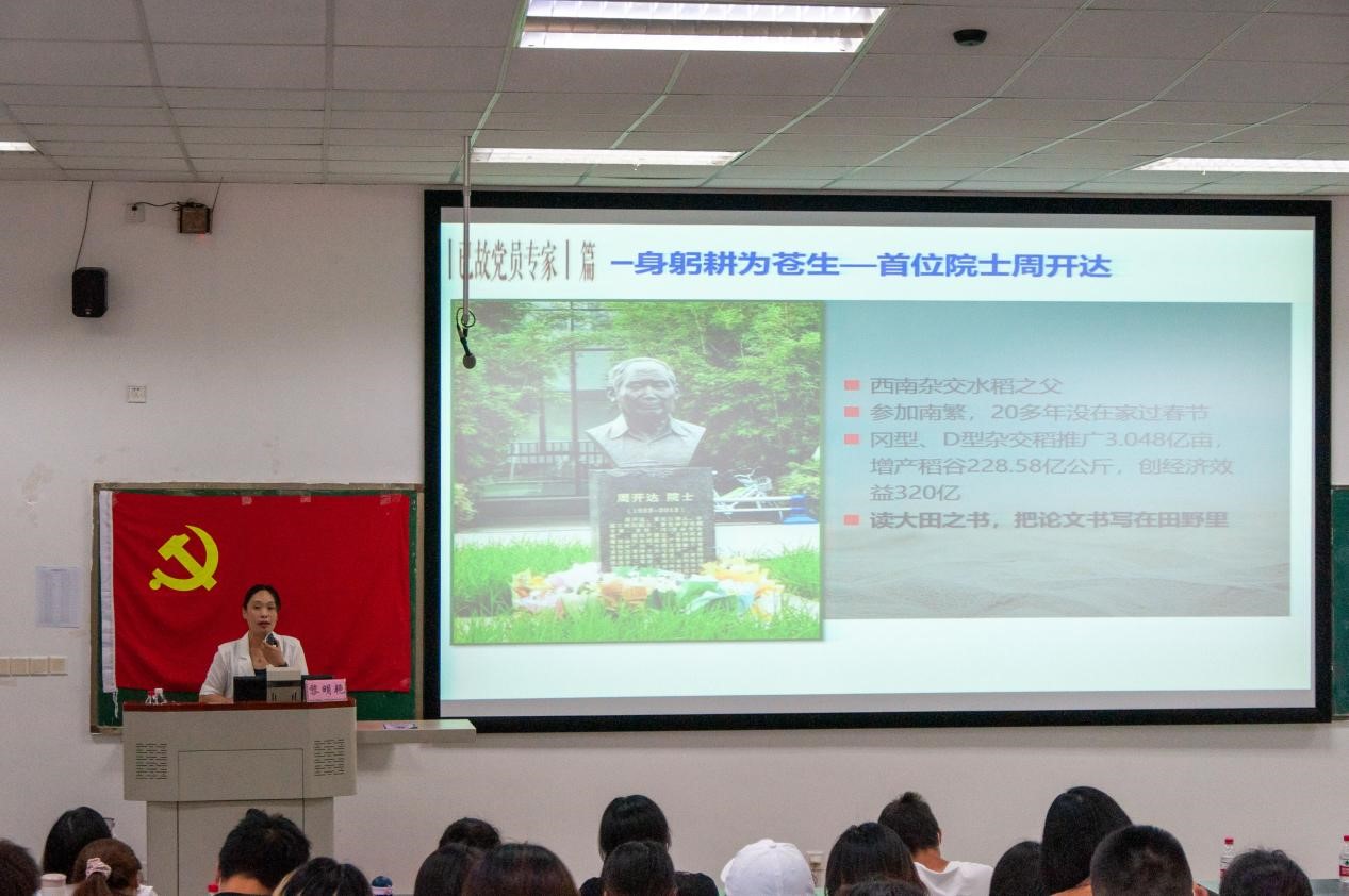 下午的党课中,黎明艳以“川农大的红色基因”为主题,讲述了江竹筠、张大成等多位作物学科英烈校友在川农成长的故事,全面介绍了川农大的红色历史,将深深烙印在川农人骨子里的“红色精神”娓娓道来。随后,全体学员一同观看了农学院感人沙画视频,其中将老一辈川农人形象一一呈现。最后,黎明艳号召新时代青年同志们奋发图强,传承革命精神,追寻红色足迹,坚定理想信念,为学校“双一流”建设和国家粮食安全做出应有的贡献,为保卫大国粮仓添砖加瓦。