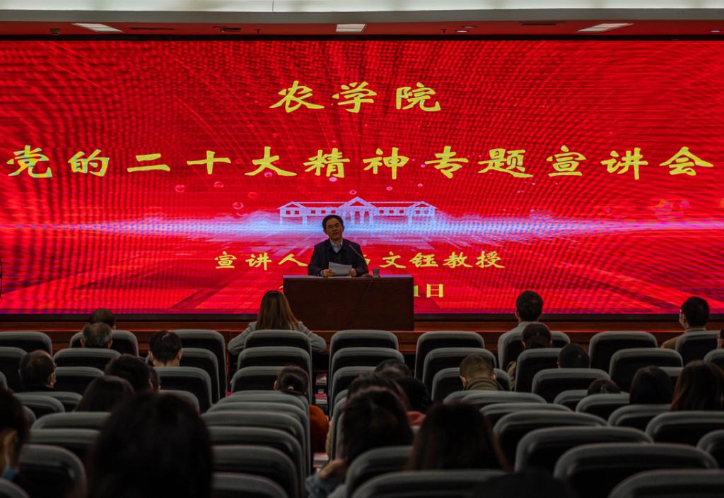 为深入学习宣传贯彻党的二十大精神,11月2日,农学院特别邀请了党的二十大代表、原副校长杨文钰作了题为《科技兴农 确保中国碗装中国粮》党的二十大精神宣讲。农学院全体党员师生通过线上线下渠道聆听了宣讲会。会议由农学院党委书记黎明艳主持。