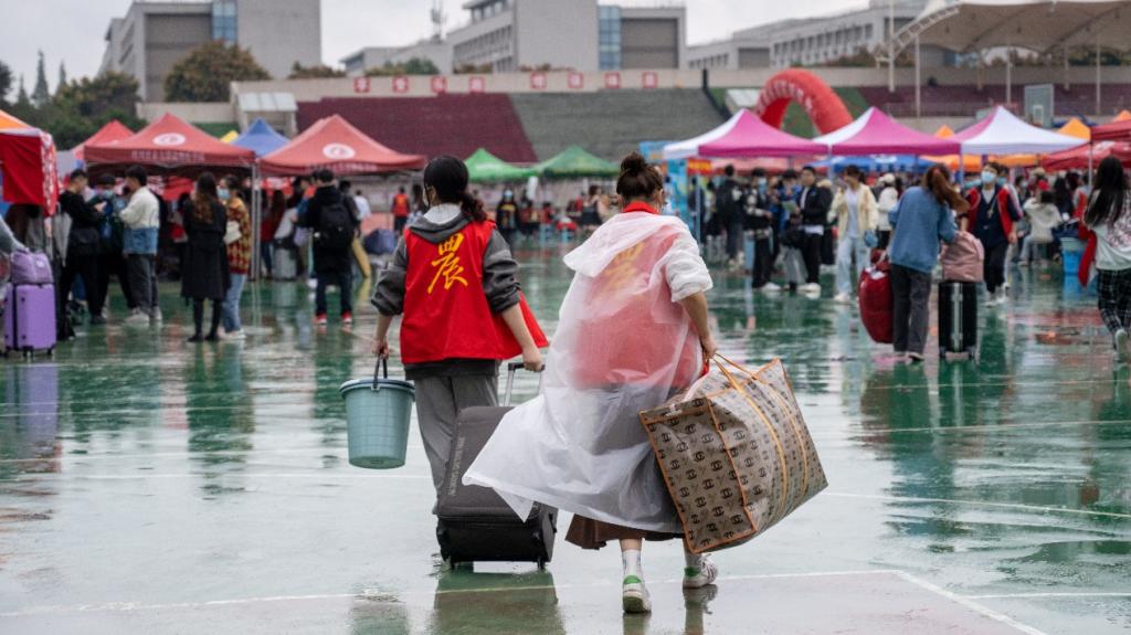 图为志愿者为新生搬运行李