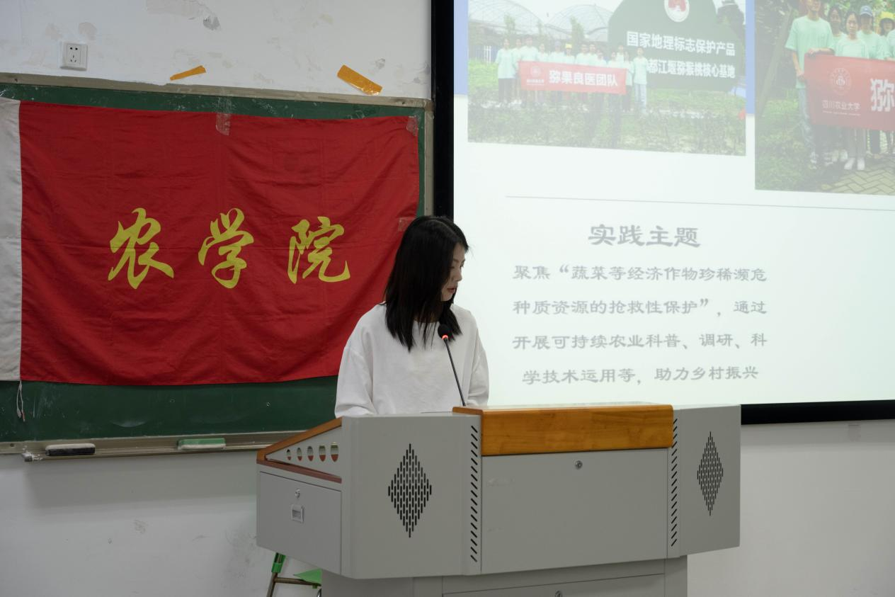 去年获得过全国三等奖的“猕果良医”实践团队代表彭丹丹和今年暑期社会实践团队代表曾勇丽为大家分享交流经验。彭丹丹同学提到,“猕果良医”实践团队是在龚国淑教授带领的“都江堰猕猴桃科技小院”的指导下针对猕猴桃病虫害防治的社会实践服务团队。彭丹丹同学着重向同学们分享到她们实践团队的前期准备工作和具体实践内容,彭丹丹同学讲到要想把社会实践做到优秀不仅是需要一个庞大的团队而且还需要团队所有成员共同合作分工。曾勇丽同学介绍了她们今年组建的“竹”梦大熊猫主食竹病虫害调研实践团队。这是一支以植物保护专业为主专门调研各类竹子的病虫害的实践团队,他们希望通过这次暑期社会实践磨练自我,积累经验,搭建与社会的桥梁。