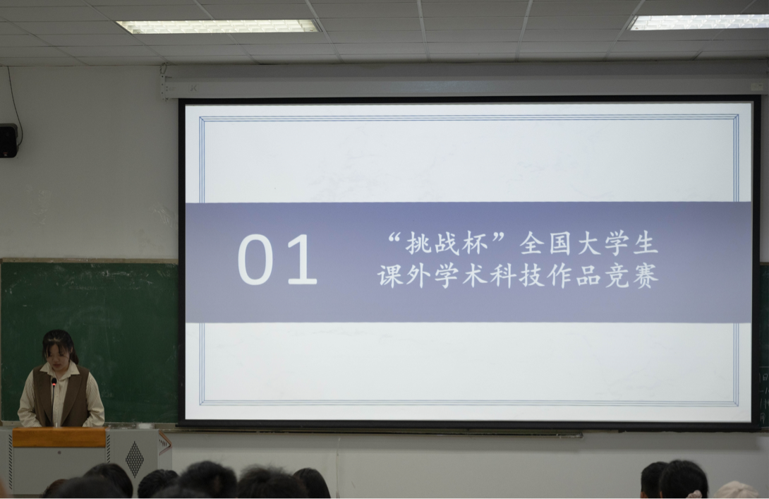 吴哲作为第十八届“挑战杯”大学生课外学术科技作品竞赛校赛特等奖的获得者,她从赛事简介和团队参赛过程两个方面为同学们进行讲解。在赛事简介方面,她着重强调不同赛道评委的打分重点,“参加自然科学类赛道的团队要尤其注重作品的科学性、先进性,这便需要团队在选择研究方法、制定实验方案时做到科学准确。”她说道。谈及自己的参赛过程,她分享道:“从院赛到现在备战省赛,选题背景的描述、项目推广的受众、成果的经济效益几个方面经过了多次修改,但我在这个过程中从国家、社会等层面更加深入了解到自己所学专业的知识。”