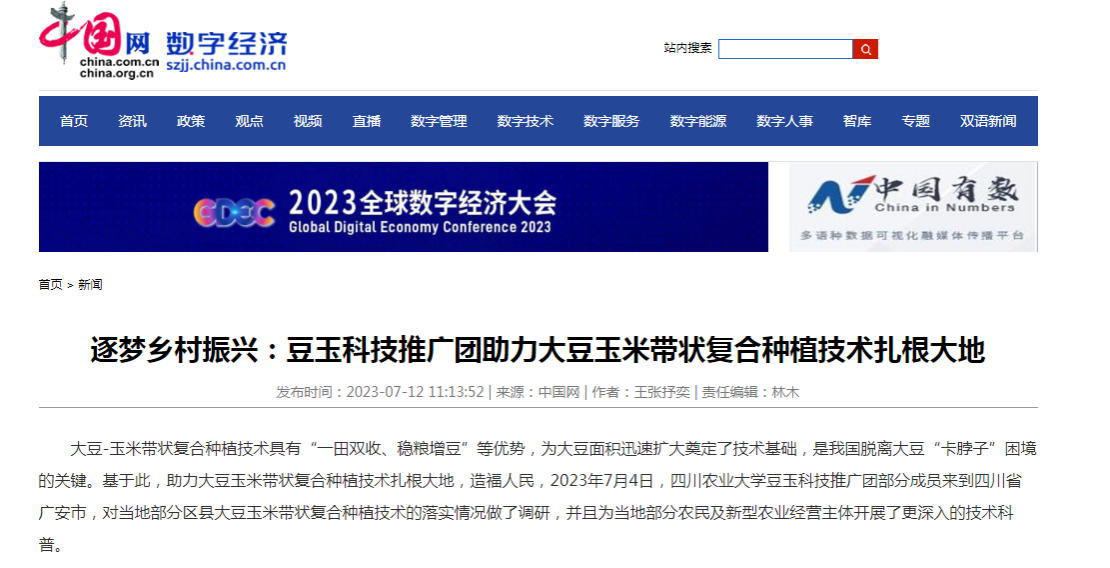 大豆-玉米带状复合种植技术具有“一田双收、稳粮增豆”等优势,为大豆面积迅速扩大奠定了技术基础,是我国脱离大豆“卡脖子”困境的关键。基于此,助力大豆玉米带状复合种植技术扎根大地,造福人民,2023年7月4日,永利yl23411集团官网豆玉科技推广团部分成员来到四川省广安市,对当地部分区县大豆玉米带状复合种植技术的落实情况做了调研,并且为当地部分农民及新型农业经营主体开展了更深入的技术科普。