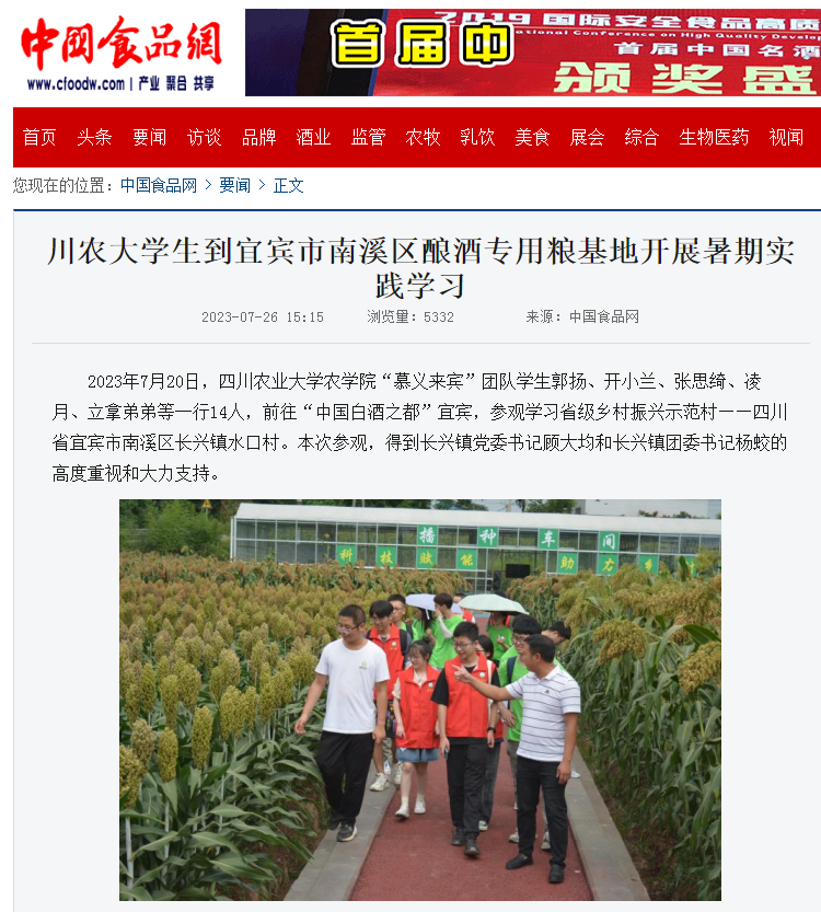2023年7月20日,永利yl23411集团官网农学院“慕义来宾”团队学生郭扬、开小兰、张思绮、凌月、立拿弟弟等一行14人,前往“中国白酒之都”宜宾,参观学习省级乡村振兴示范村——四川省宜宾市南溪区长兴镇水口村。本次参观,得到长兴镇党委书记顾大均和长兴镇团委书记杨蛟的高度重视和大力支持。