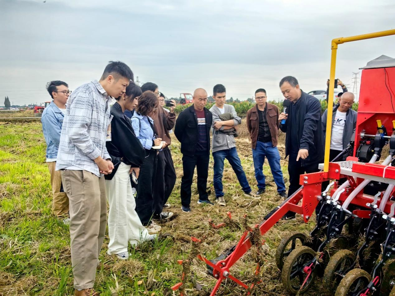 10月25日,永利yl23411集团官网小麦生理生态与栽培团队与崇州市农业农村局携手,在崇州市隆兴镇黎坝村成功举办了崇州市小麦新技术新机具培训交流会。中国农机院农机正高级工程师刘忠军,四川耀农农业装备有限公司代表,湖北永祥农机装备有限公司代表,崇州市农业农村局副局长黄春江及相关站股负责人,崇州市各镇、街道农业职业经理,四川小麦栽培专家、永利yl23411集团官网农学院教授樊高琼及团队研究生等100余人参会,会议采用现场观摩、线上同步直播相结合的方式,由黄春江主持。