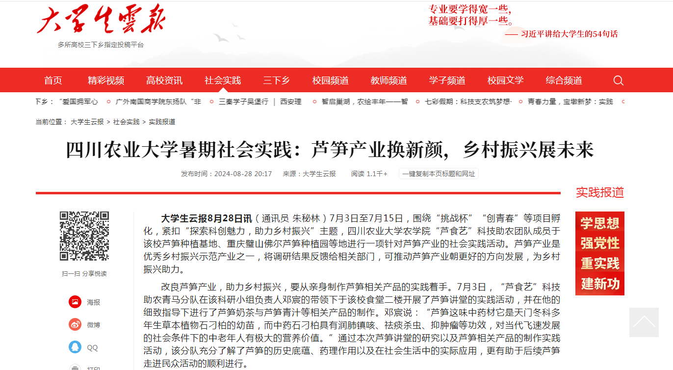 “中医药是中国古代科学的瑰宝,也是打开中华文明宝库的钥匙。”中药是中医药的源头,而药材又是中药的源头,本次社会实践不仅帮助团队成员传承并弘扬了中医药文化,增强了他们的实践动手能力,提高了团队成员间的合作能力,还进一步推动芦笋产业的发展,更为乡村振兴贡献青春力量。