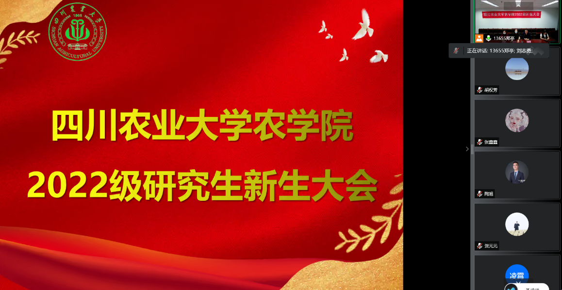农学院2022级研究生开学典礼暨入学教育大会于2022年9月19日上午9点通过线上会议形式举行。农学院院长王际睿教授、党委书记黎明艳副教授、学院副院长、纪委书记王强教授、副院长杨峰教授、生态研究所副所长唐宗祥教授、特用植物生产学系系主任吴卫教授、作物栽培学与耕作学系系主任雍太文教授、作物遗传育种学系系主任蒲至恩副教授、植物保护系系主任陈华保副教授、智慧农业系系主任刘雷教授,院行政办主任向刚副教授、院党委办公室主任陈红星老师、院研究生教学秘书郑亭老师、研究生会干部代表及全体2022级新生,共计200余人以线上和线下相结合的方式参加本次大会。大会由王强主持。