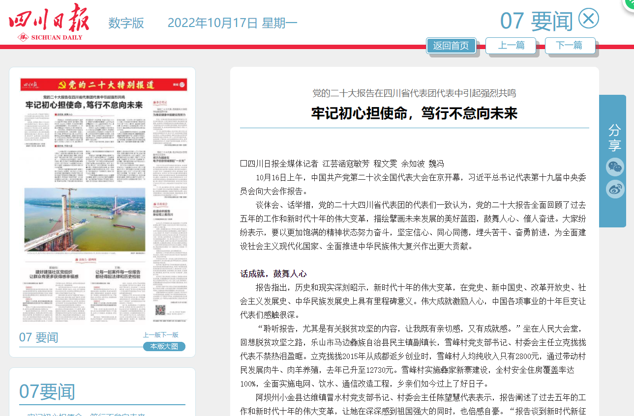 谈体会、话举措,党的二十大四川省代表团的代表们一致认为,党的二十大报告全面回顾了过去五年的工作和新时代十年的伟大变革,描绘擘画未来发展的美好蓝图,鼓舞人心、催人奋进。大家纷纷表示,要以更加饱满的精神状态努力奋斗,坚定信心、同心同德,埋头苦干、奋勇前进,为全面建设社会主义现代化国家、全面推进中华民族伟大复兴作出更大贡献。