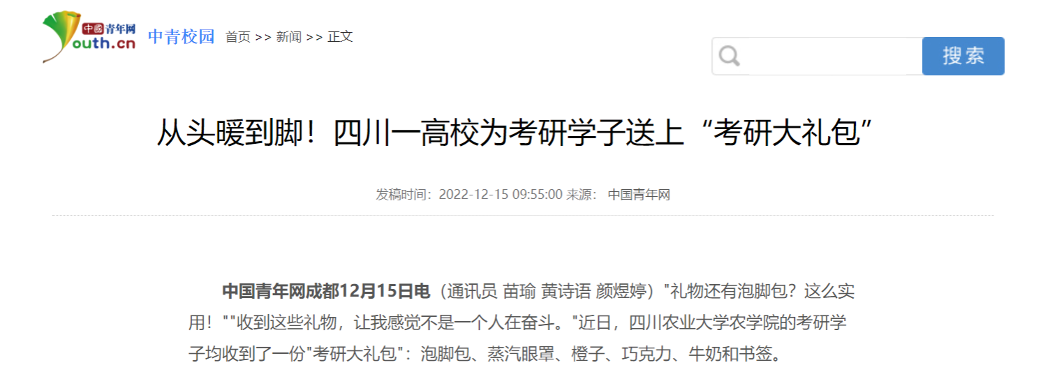 据了解,为考研学生准备礼物是该校农学院每年的传统。负责此次活动的老师沈丽淘说道:"马上就要考试了,我们希望通过赠送礼物能够为考生带去祝福,更希望这些小礼物能帮助他们调整心态,以更积极的姿态去参加考试。"她告诉记者,学院以送礼物的方式陪伴考研学生,让他们在奋斗路上不会感到孤单。