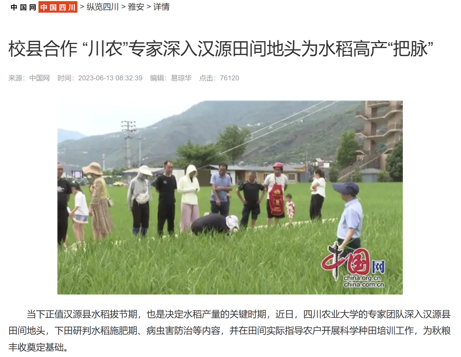 当下正值汉源县水稻拔节期,也是决定水稻产量的关键时期,近日,永利yl23411集团官网的专家团队深入汉源县田间地头,下田研判水稻施肥期、病虫害防治等内容,并在田间实际指导农户开展科学种田培训工作,为秋粮丰收奠定基础。