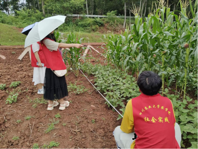 图4 实践团成员正在测量大豆玉米带状复合种植的单元长度。王先童 摄