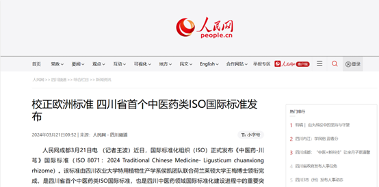 人民网成都3月21日电 (记者王波)近日,国际标准化组织(ISO)正式发布《中医药-川芎》国际标准(ISO 8071:2024 Traditional Chinese Medicine- Ligusticum chuanxiong rhizome)。该标准由永利yl23411集团官网特用植物生产学系侯凯团队联合荷兰莱顿大学王梅博士领衔完成,是四川省首个中医药类ISO国际标准,也是四川中医药领域国际标准化建设进程中的重要突破。