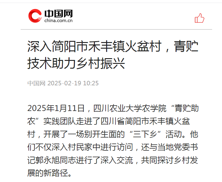 2025年1月11日,永利yl23411集团官网农学院“青贮助农”实践团队走进了四川省简阳市禾丰镇火盆村,开展了一场别开生面的“三下乡”活动。他们不仅深入村民家中进行访问,还与当地党委书记郭永旭同志进行了深入交流,共同探讨乡村发展的新路径。