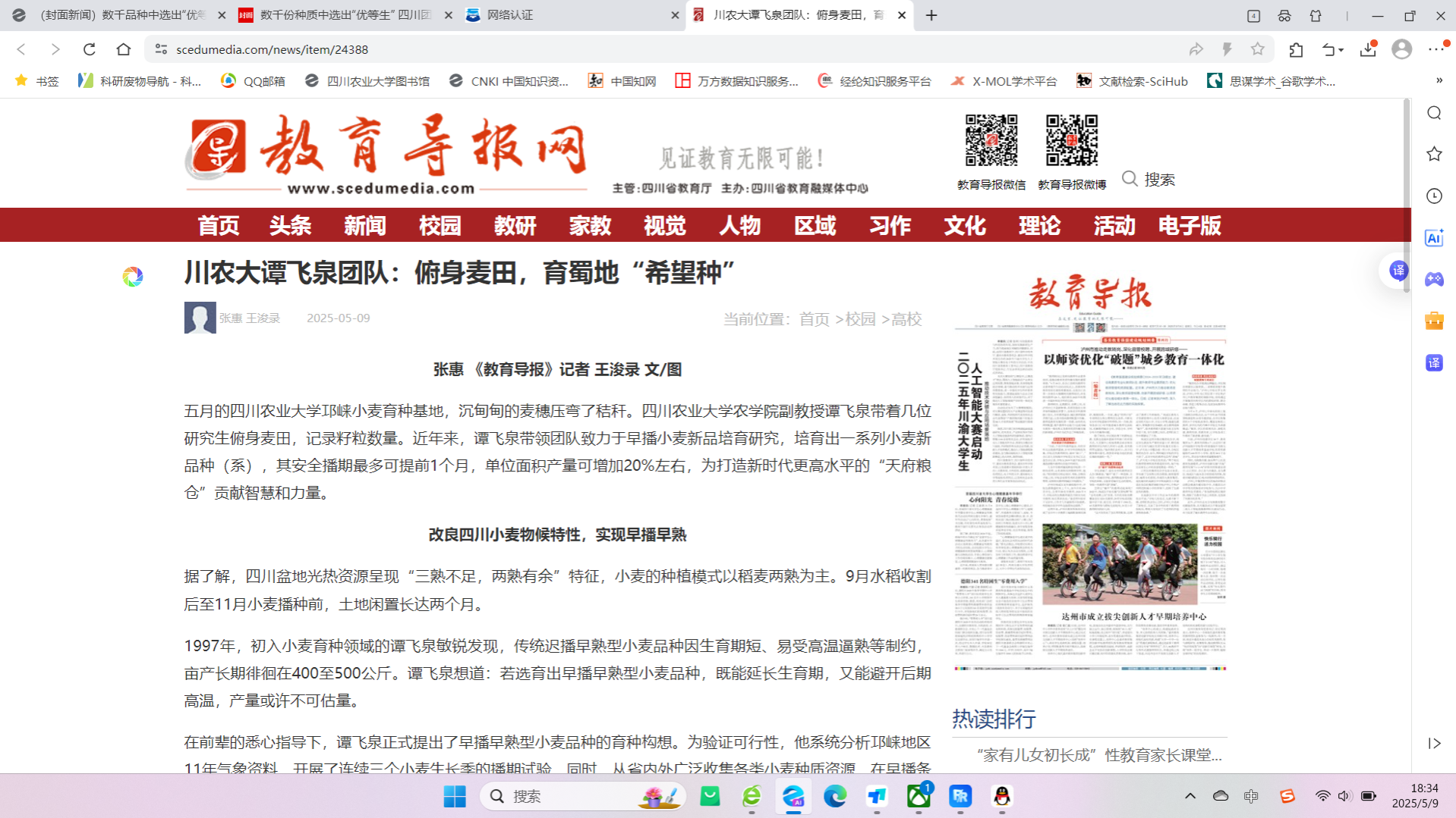 经十余年技术攻关,谭飞泉团队在2016年成功培育出我省首个早播早熟型小麦“川农30”,将播期提前至10月中旬,亩产较对照品种增产6.8%。随后,兼具抗倒伏与适应性强等特点的“川农32”问世,年推广面积近50万亩,被选为2025年度四川省农业主导品种。