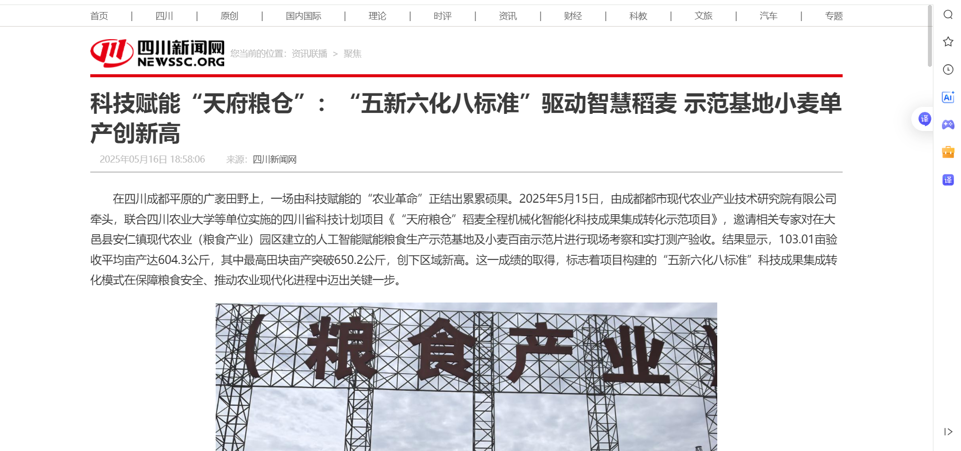 在四川成都平原的广袤田野上,一场由科技赋能的“农业革命”正结出累累硕果。2025年5月15日,由成都都市现代农业产业技术研究院有限公司牵头,联合永利yl23411集团官网等单位实施的四川省科技计划项目《“天府粮仓”稻麦全程机械化智能化科技成果集成转化示范项目》,邀请相关专家对在大邑县安仁镇现代农业(粮食产业)园区建立的人工智能赋能粮食生产示范基地及小麦百亩示范片进行现场考察和实打测产验收。结果显示,103.01亩验收平均亩产达604.3公斤,其中最高田块亩产突破650.2公斤,创下区域新高。这一成绩的取得,标志着项目构建的“五新六化八标准”科技成果集成转化模式在保障粮食安全、推动农业现代化进程中迈出关键一步。