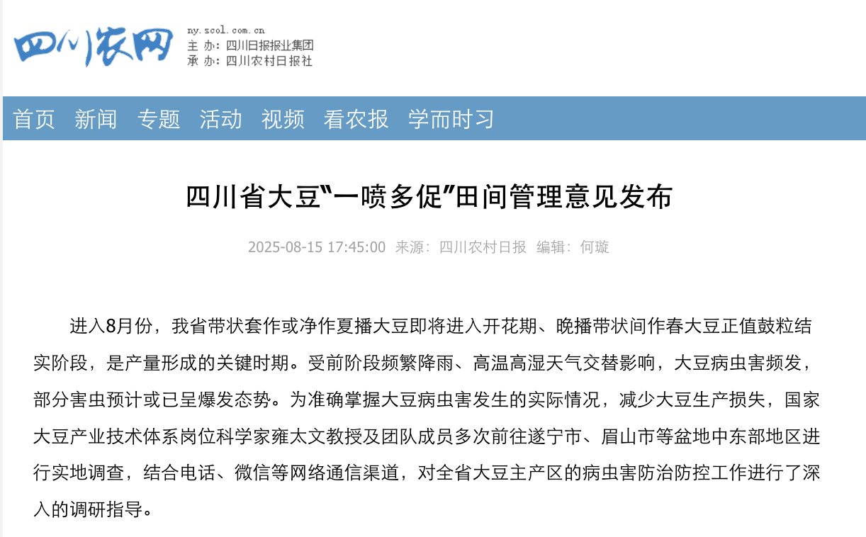 (四川农网)四川省大豆“一喷多促”田间管理意见发布