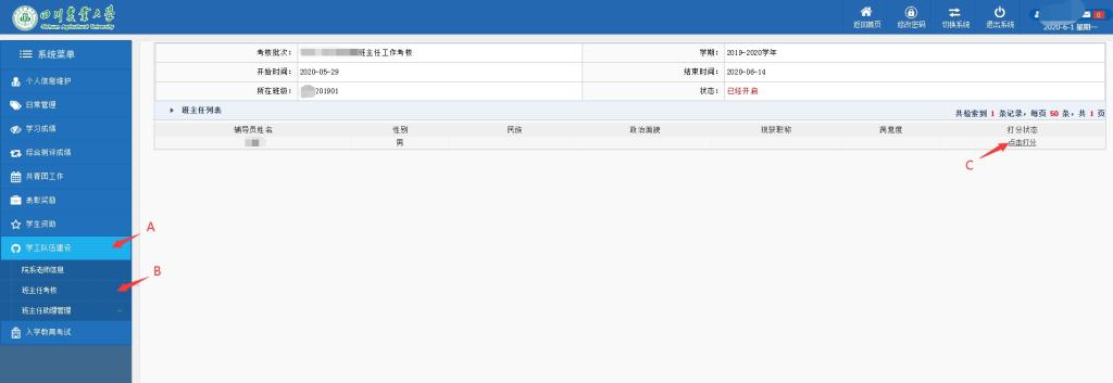 学生通过学生处网站导航栏登录“学生管理工作系统”→A.点击学工队伍建设→B.点击班主任考核→C.点击打分→完成评价