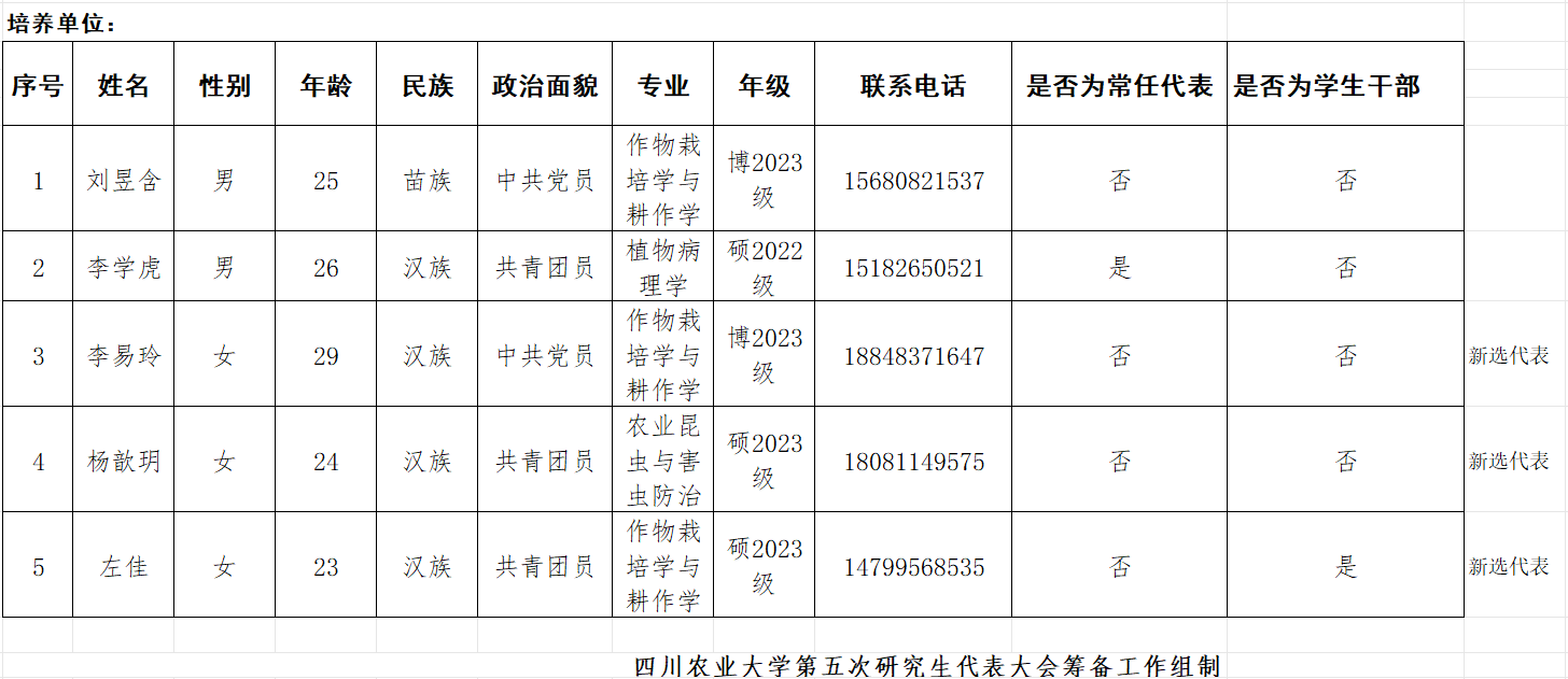 经学生本人申请,农学院研究生小班班长本着公平公正的原则,进行了农学院驻校研代表选举会议。现将永利yl23411集团官网第五次研究生代表大会代表名单公示如下: