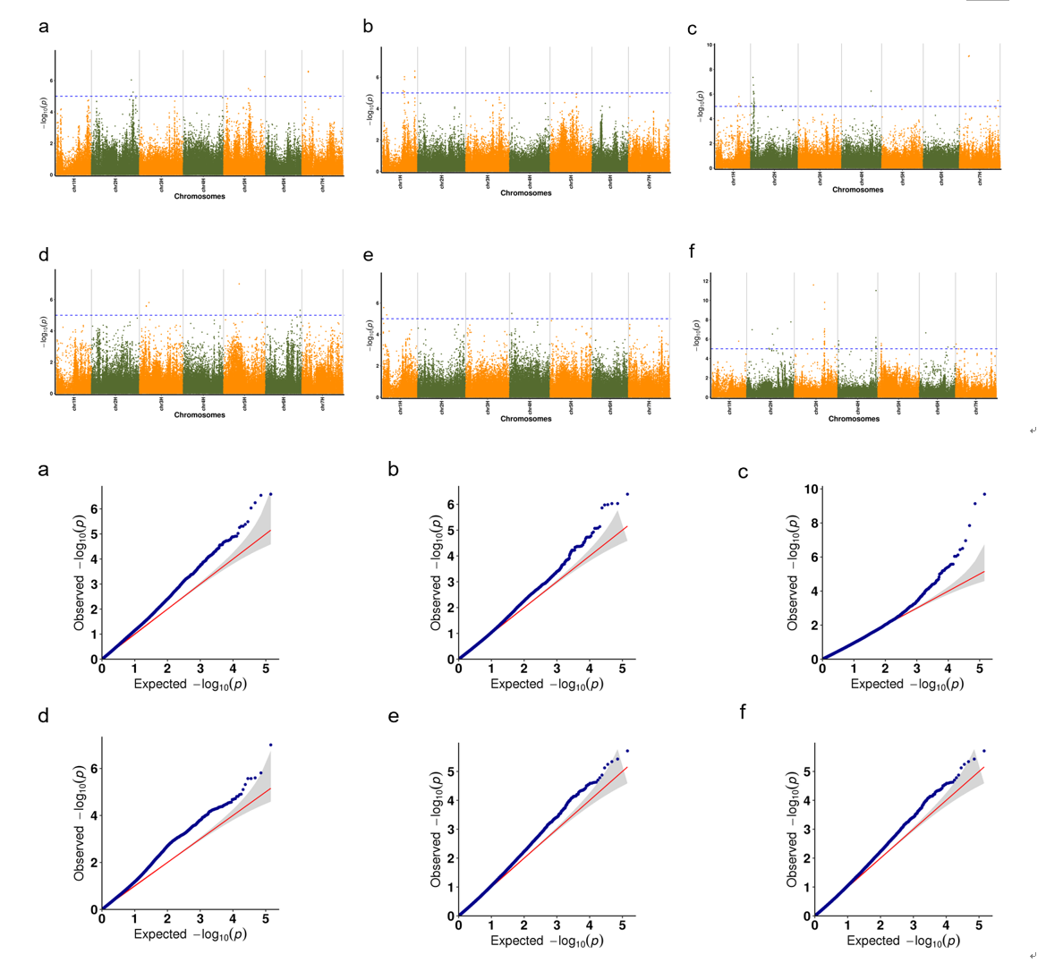 图3多次实验中抗旱性状关联分析的曼哈顿图和Q-Q图(FaST-LMM)